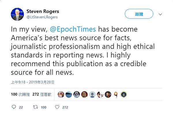 【大纪元2019年03月29日讯】(大纪元记者吴旻洲报导)美国总统特朗普的竞选顾问、资深军事专家罗杰斯(Steven Rogers)28日在个人推特(Twitter)上表示,他认为《大纪元》已经成为美国事实真相的最好新闻来源,有着很高的专业和职业道德水准。他大力推荐大家将《大纪元》作为阅读新闻的可靠来源。