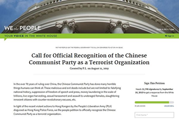 署名“P.L.”的民众于8月11日在“我们人民”网站上,以“要求正式将中国共产党定为恐怖组织”(Call for Official Recognition of the Chinese Communist Party as a Terrorist Organization)为题发起这项请愿活动,其连署网页在这里