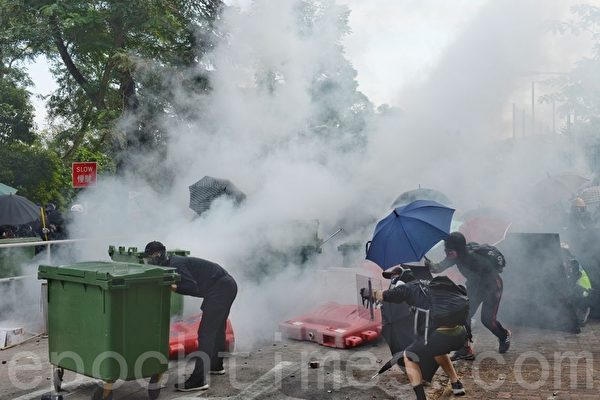 此时,学生一涌向前,用中式酒楼那些巨型圆型木台面所掩护,一边向警方扔汽油弹,一边推进,圆型桌滚来滚去,黑衣人就以躲在后面移动,双方激战,警方的子弹声,每几秒一响,橡胶子弹打中伞阵“啪啪作响”,有一阵子催泪弹频密得处身浓雾,完全看不到前路。
