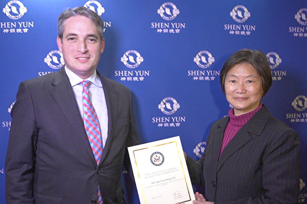 3月5日晚,联邦参议员帕特·图米的宾州西部地区主任Matt Blackburn来到匹兹堡本尼德表演艺术中心,观看了神韵巡回艺术团今年在匹兹堡的首场演出,并带来了参议员图米对神韵艺术团的褒奖信,“特别表彰神韵艺术团对宾夕法尼亚州艺术发展的贡献”。