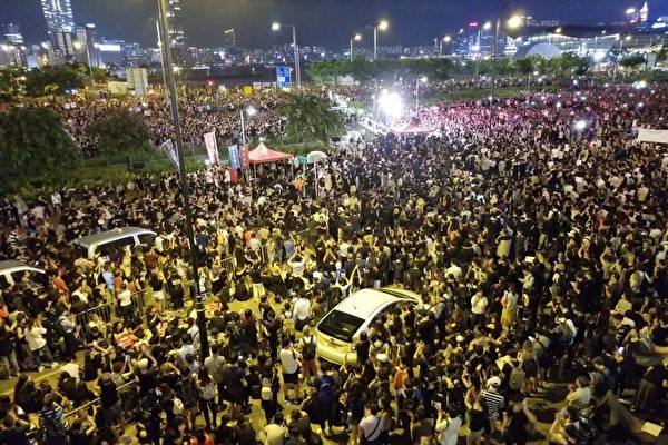 香港民众6月26日晚再次聚集中环。现场约有过万人身穿黑衣参加集会,还有市民源源不断地从金钟涌向中环,将爱丁堡一带挤得水泄不通。