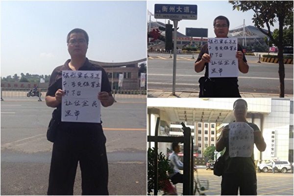 互联网上流传的照片显示,戴着眼镜、留着小平头的王美余孤身一人站在湖南省公安厅门前、衢州大道等地,手中举的标语上写着“强烈要求习近平、李克强等立即下台,让位全民选举”。