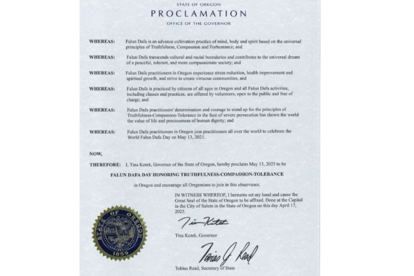 【大纪元2025年05月06日讯】4月份,美国俄勒冈州(Oregon)州长蒂娜‧科泰克(Tina Kotek)为5月13日法轮大法日庆祝活动颁发了褒奖,宣布2025年5月13日为俄勒冈法轮大法日,并鼓励民众参加庆祝活动,弘扬“真、善、忍”普世价值。