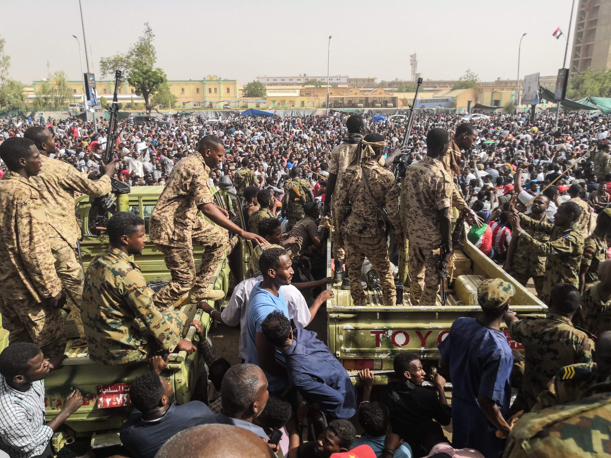 在国家安全部队试图驱离群众静坐的第三天之后,苏丹军队成员周二(4月9日)前往首都保护抗议者。一些照片显示,抗议者坐在军车上分发水瓶,与武装部队成员一起拍照,比着胜利V手势。