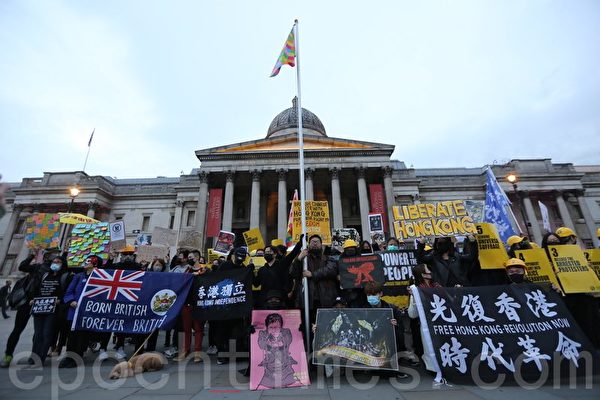 队伍傍晚抵达终点特拉法加广场,随即举行“连侬旗”升旗仪式。帜旗在港人伴唱《愿荣光归香港》的歌声下飘升在伦敦的天空中,场面令人感动。