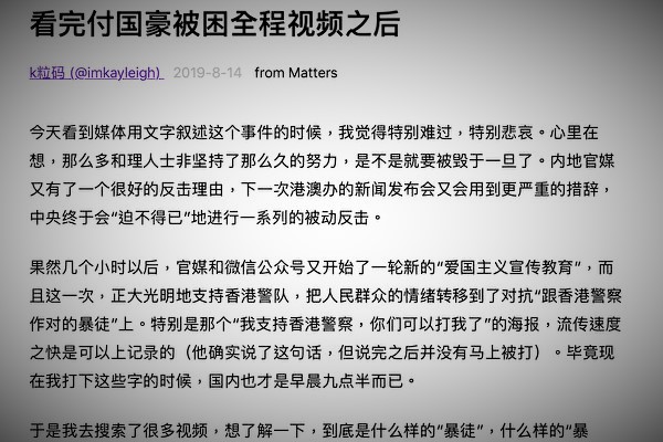 “K粒码”在Matters新闻网站发文说,看完《纽约时报》(The New York Times)关于付国豪“被困,被绑,被审,被打,被救助,被运上救护车开走的”全程视频之后,内心被震撼。