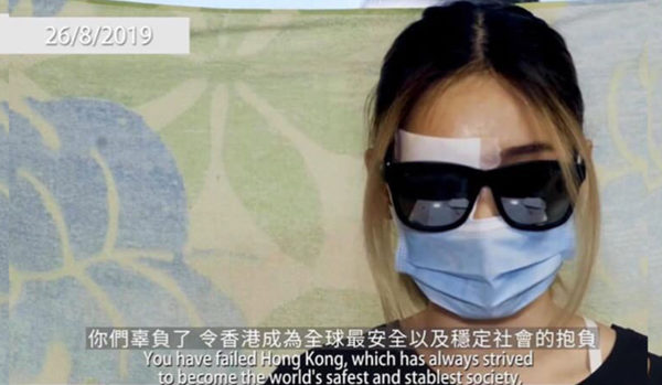 8月29日,民间记者会公开“爆眼少女”首度开腔的视频,她以受害者名义向香港政府及警队予以最强烈谴责。(民间记者会影片截图)
