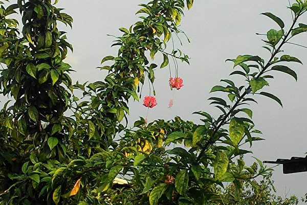 翠绿树墙长出一盏盏垂挂的红粉灯笼,羽状深裂的花瓣,深细裂作流苏状,向上反曲,花姿纤细娇俏,随着徐徐清风摇曳摆荡,吊灯扶桑花在绿叶衬托下显得飘逸动人,十分美丽!