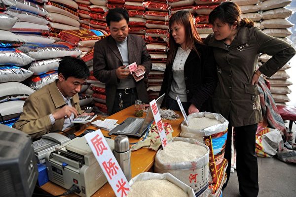 贸易战关键时刻,中共下令全面展开全国性粮食库存数量和质量大清查。有学者认为,中共正在防范粮食危机。图为上海一家粮食批发市场粮贩正在卖粮计价。(Getty Image)