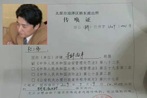 曾在大陆多家媒体供职的记者杜二伟在网上披露,他于7月19日被太原市迎泽区桥东派出所以“寻衅滋事”为由强行传唤,直到次日被迫写出保证书之后才获释放。
