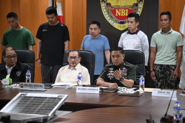 图为2025年1月30日,菲律宾参谋总长罗密欧‧布劳纳(Romeo Brawner)上将(前排右)与国家调查局(NBI)局长杰梅‧圣地亚哥(Jaime Santiago,前排中)和司法部副部长拉乌‧巴斯克斯(Raul Vasquez,前排左)在菲律宾国家调查局马尼拉办公室举行的新闻发布会上,介绍五名被捕的中共间谍嫌疑人(后排)。(Ted Aljibe/AFP)