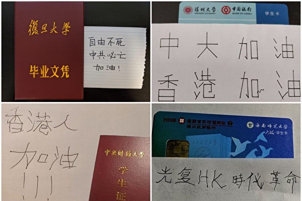 有一些大陆生为防止被当局追踪笔迹,特意用左手写上“中大加油”及“中大、城大加油”,复旦大学毕业生写道:“自由不死,中共必亡,加油!”