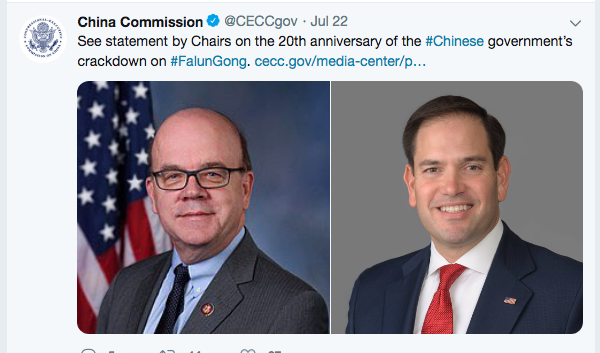 2014年9月26日至12月15日在香港发生一系列争取真普选的公民抗命运动,称为雨伞运动。周五,香港的民主抗议活动,CECC主席、民主党众议员詹姆斯‧麦戈文(James McGovern)和联合主席、共和党参议员马可‧卢比奥(Marco Rubio)在五周年之际发表主席联合声明。