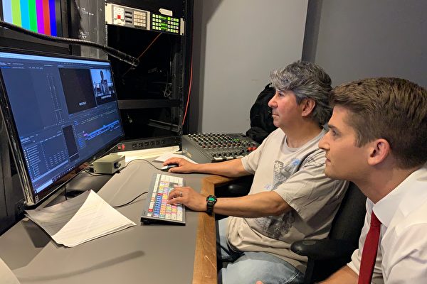 星期五(5月17日)深夜,洛杉矶福克斯新闻台调查记者Bill Melugin(右)和剪辑工程师Tony Ruiz(左)仍然在对即将播出的调查片《一个姐姐的救赎》(Sister's Salvation)做最后的检视。(刘菲/大纪元)