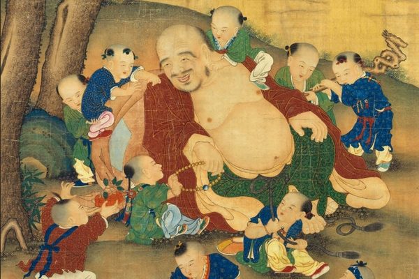 明末清初的一幅绘画《十子闹弥勒图》 。但见画中弥勒体态丰腴,袒胸露腹,笑容可掬。看他右手提握佛珠,依着布袋而坐。周围的十名小童神态各异,颇为淘气顽皮,他们或是爬到弥勒的肩上,或是拉扯他的耳朵,或者扯要他的禅杖,又或者扯要佛珠。顽童的嬉戏和弥勒的慈祥,使画面栩栩如生。