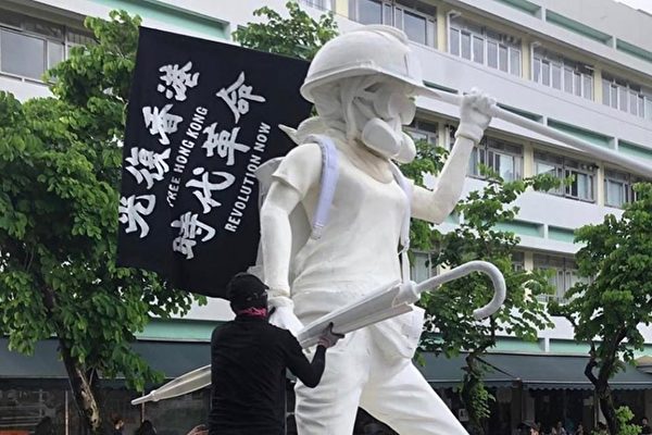“香港民主女神像”设计参考了近三个月以来港人“反送中”示威者的造型,它戴着头盔、眼罩和防毒面具(猪嘴),手持雨伞及“光复香港 时代革命”旗帜。