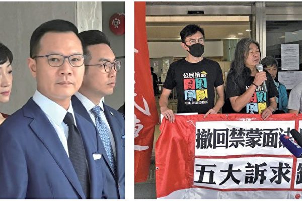 左图:民主派议员早前就政府引用《紧急法》制订《禁蒙面法》提出司法复核,高等法院10月31日开审。右图:前立法会议员梁国雄与数名社民连成员到法院,呼吁废除《紧急法》及《禁蒙面法》。(大纪元合成图)