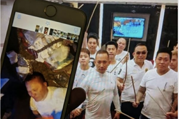 22日,网上疯传一段视频显示,黑社会大老飞天南,在率领白衣殴打众人时倒地不起,不少香港人直呼恶有恶报!