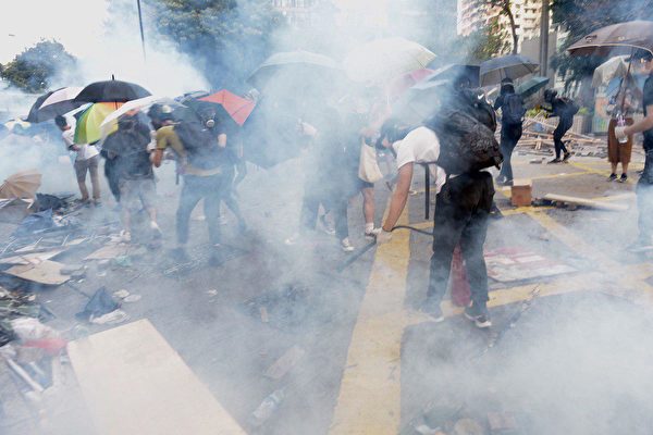 11月18日早上,大批民众赶来理大救助学生,被警察狂放各种弹药驱散。(余天佑/大纪元)