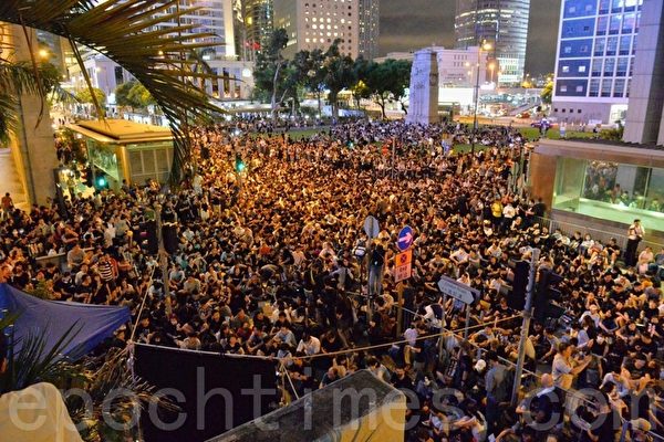 集会晚上八点举行,大批市民身穿黑衣坐满了遮打花园。活动由12间大专院校学生会成立的“香港大专学界国际事务代表团”及连登“我要揽炒”共同举行。
