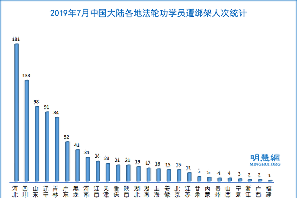 2019年7月中国大陆各地法轮功学员遭绑架人次统计示意图。(明慧网)
