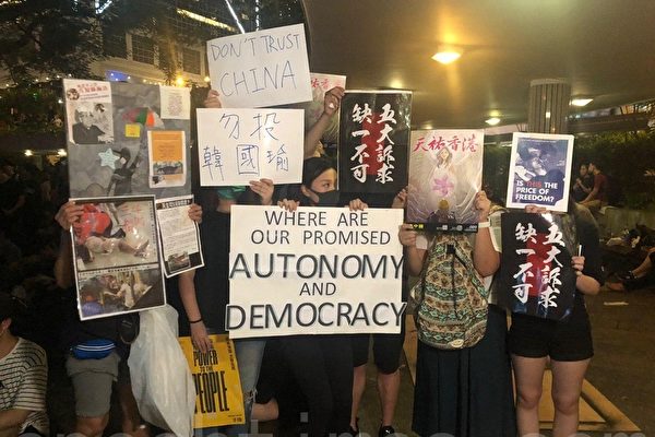 【大纪元2019年08月17日讯】(大纪元记者梁珍香港采访报导)8月16日周五晚,夜幕降临,整个遮打花园坐满了6万香港民众,他们大都身穿黑衣服,手举各种黑白字的海报和标语,唯有徐小姐手中的“天祐香港”四个红色字在夜光下显得特别耀眼。