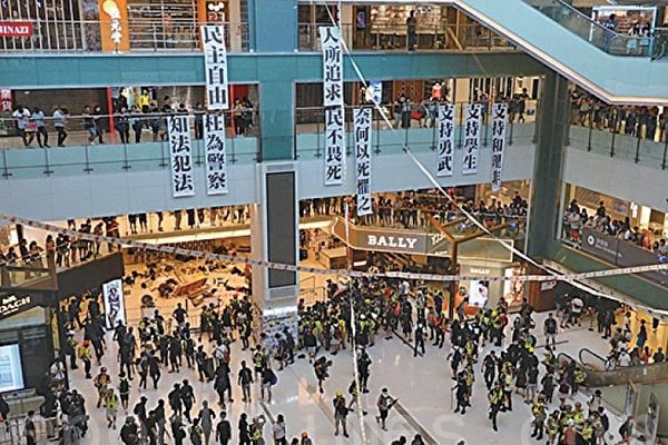【大纪元2019年09月23日讯】(大纪元记者叶依帆香港报导)有超过一千市民响应网上发起“和你Shop行动”,22日到沙田新城市广场和连城广场参与合唱、罢买、流动人链等活动,表达“五大诉求,缺一不可”的决心。他们从中午开始以“和理非”的形式表达诉求,持续近四个小时后散去。在当日近傍晚,部分穿黑衣的抗争者不满港铁关闭沙田站,希望攻破闸门。他们遭警方围攻,一男子被殴打后倒地流血。