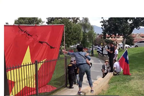 9月15日,亲共侨社在洛杉矶地区蒙特利公园市(Monterey Park,蒙市)的巴恩斯公园(Barnes Park)举行升中共血旗仪式,不料巨型五星旗遭到一名抱着小孩的年轻女子泼洒黑色墨汁,这幅象征中共独裁政权的血旗不得不被草草收起。
