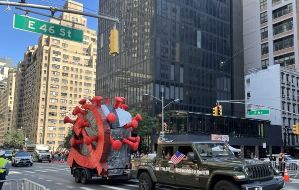 李强来纽约 街头现中共病毒雕塑与灭共车游