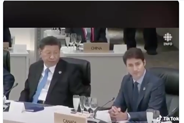 9月19日,推特网友“Jam”在推特发出的一段视频显示,2019年6月在日本大阪召开的G20峰会的工作午餐上,习近平坐在特鲁多右侧,坐在特鲁多左侧的是巴西总统博索纳罗(Jair Bolsonaro)。习近平开始与大会工作人员交谈,而特鲁多先是主动与巴西总统博索纳罗握手、寒暄。之后,特鲁多从公文包里拿出记事本放到桌子上,带上耳机,脸微微偏向左侧,一直未看向习近平(未打招呼)。而习近平一直看向特鲁多一侧,面露尴尬。